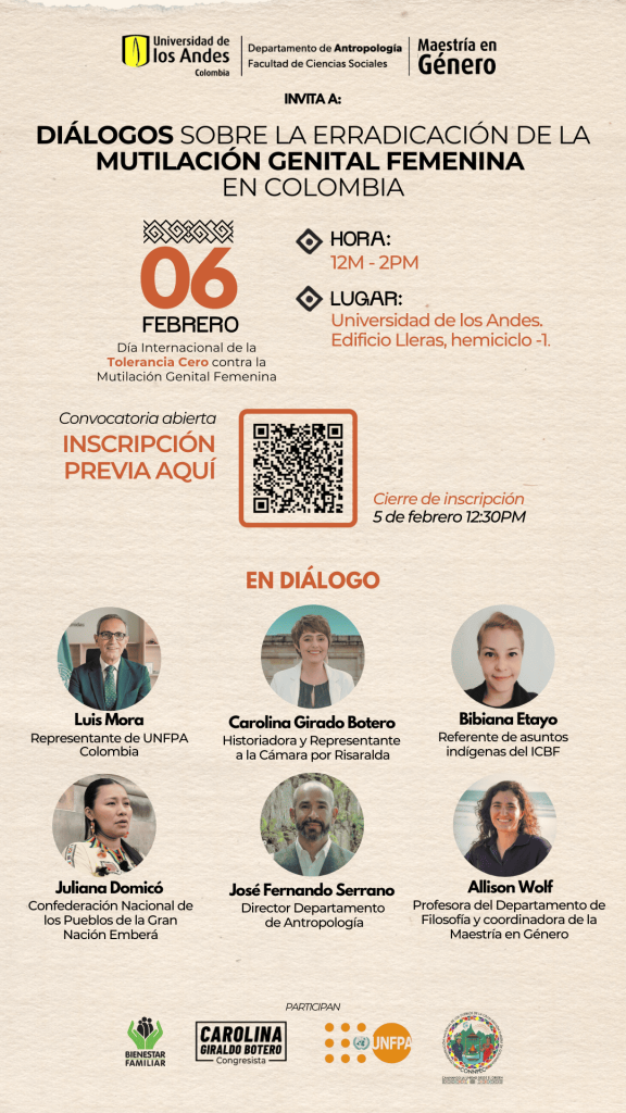 En el marco de la conmemoración del Día Internacional de la Tolerancia Cero contra la Mutilación Genital Femenina – 6 de febrero, se realiza este espacio de diálogo para visibilizar y reflexionar sobre esta práctica nociva en niñas y mujeres en el mundo. Colombia es el único país del continente americano que reconoce la práctica de la ablación o mutilación genital femenina, donde de acuerdo con registros del SIVIGE, en 2025 se registraron 39 casos de ablación o mutilación genital femenina en el país, afectando principalmente a niñas entre 0 y 5 años.